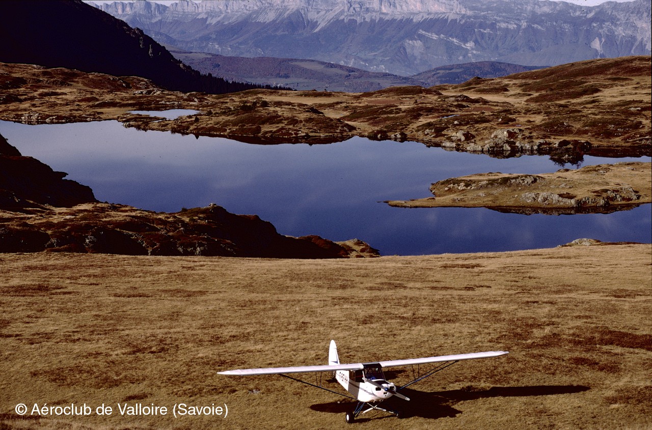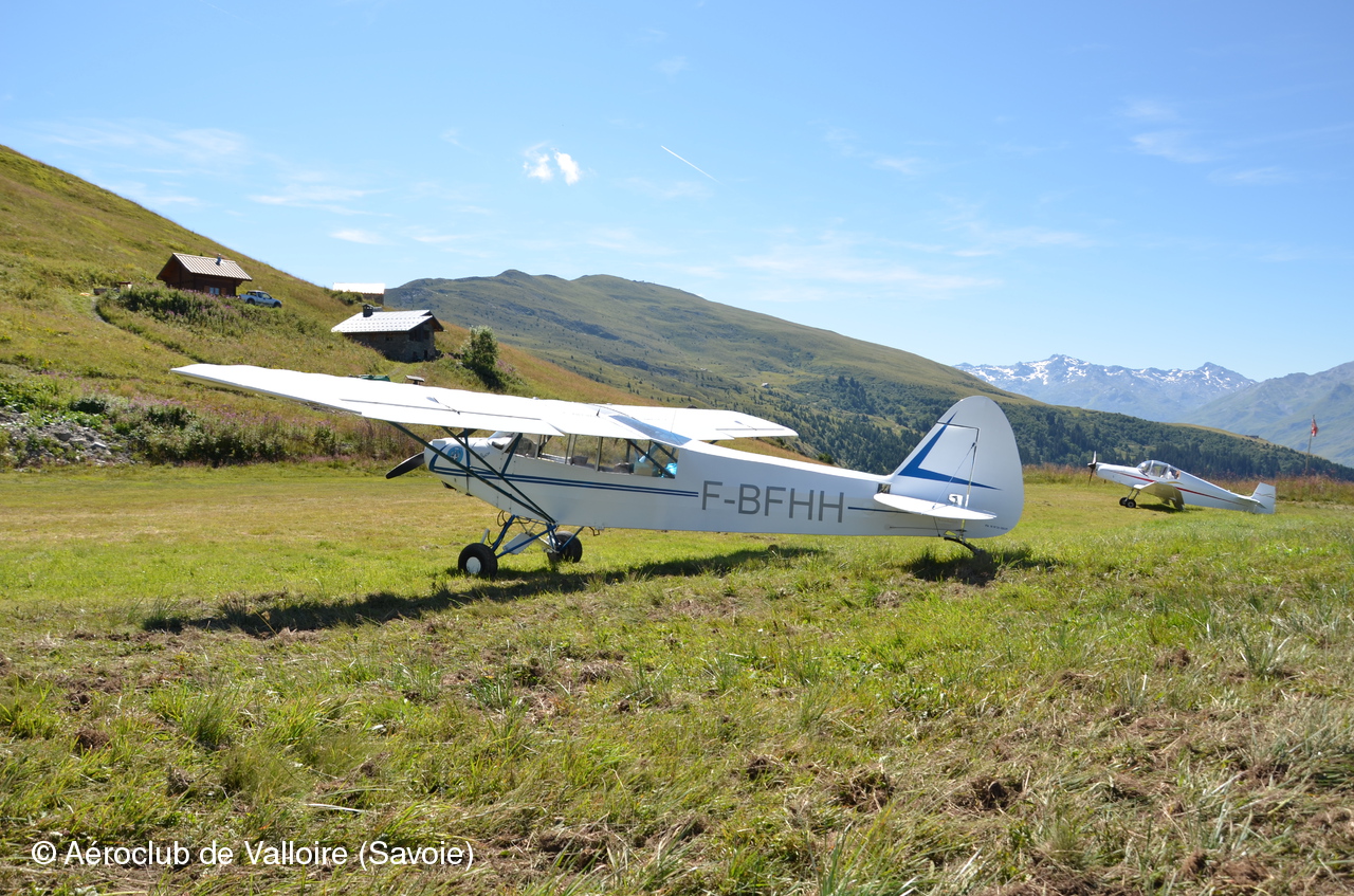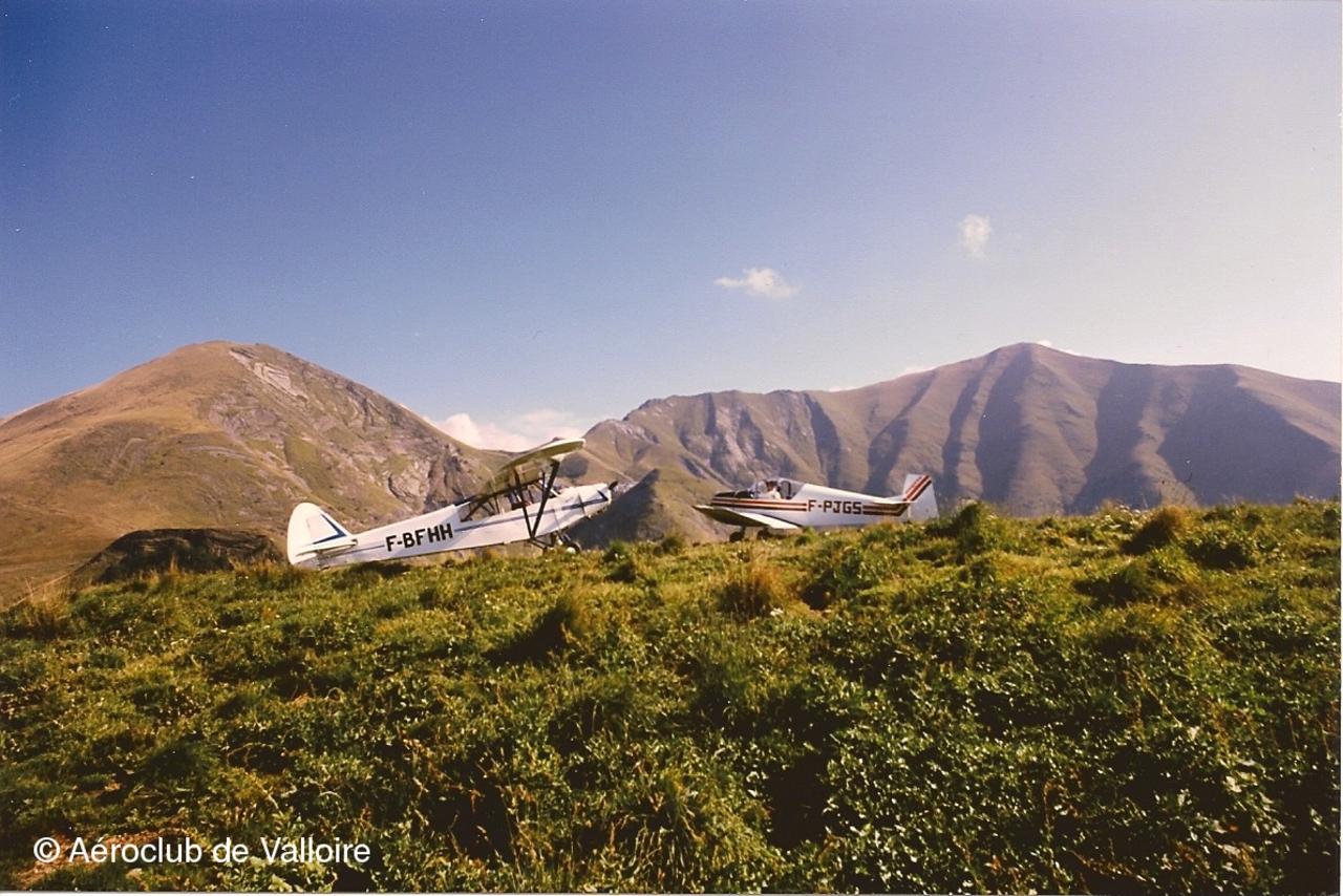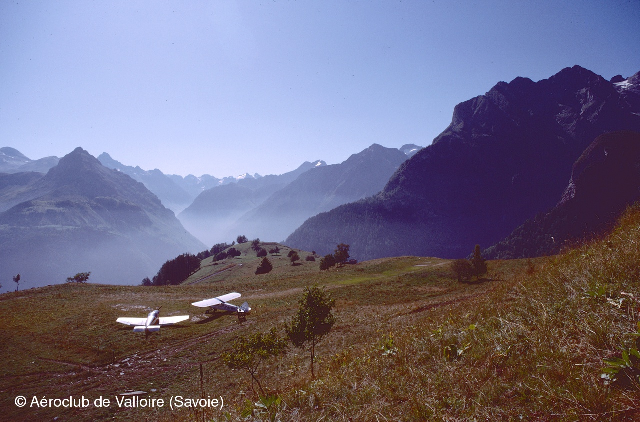 La somptueuse piste d'atterrissage de Villard-Notre-Dame et sur l'aire de stationnement: F-BFHH (PIPER L-18C) et F-PYFM (FERRIERE LF O2).