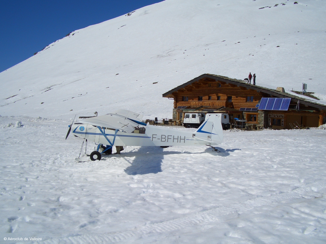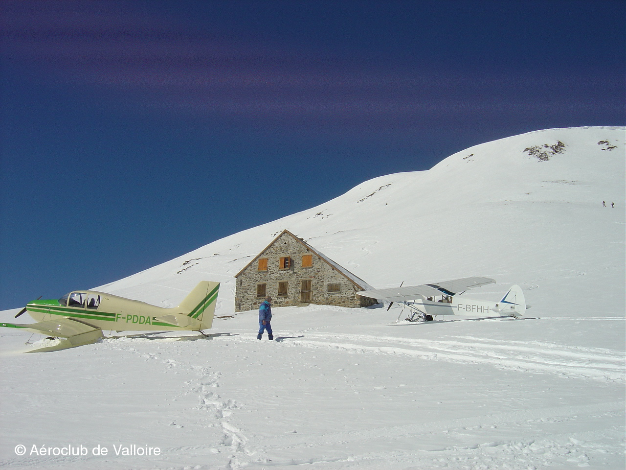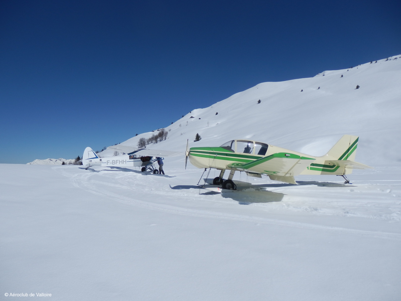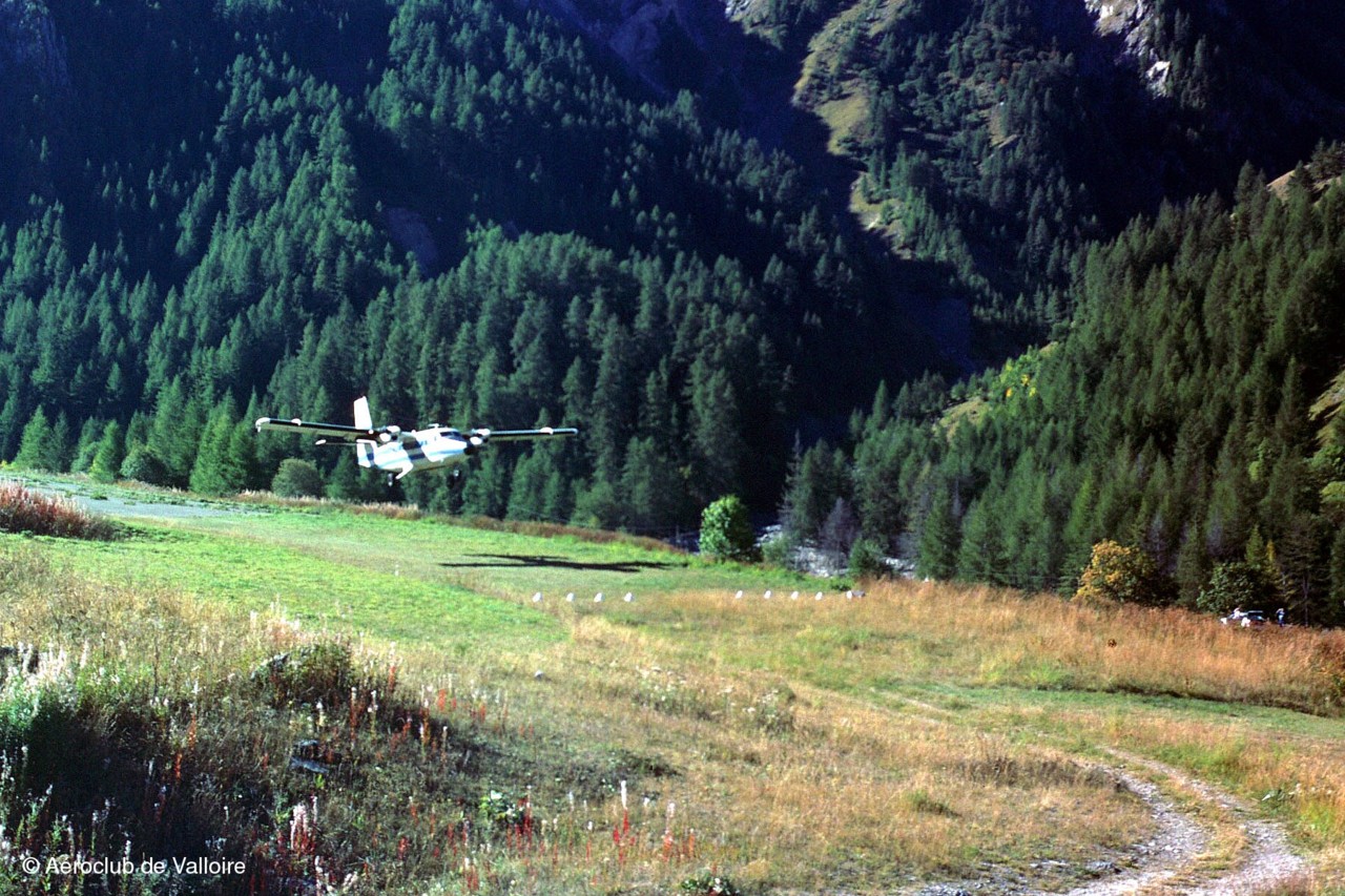 La somptueuse piste d'atterrissage de Villard-Notre-Dame et sur l'aire de stationnement: F-BFHH (PIPER L-18C) et F-PYFM (FERRIERE LF O2).