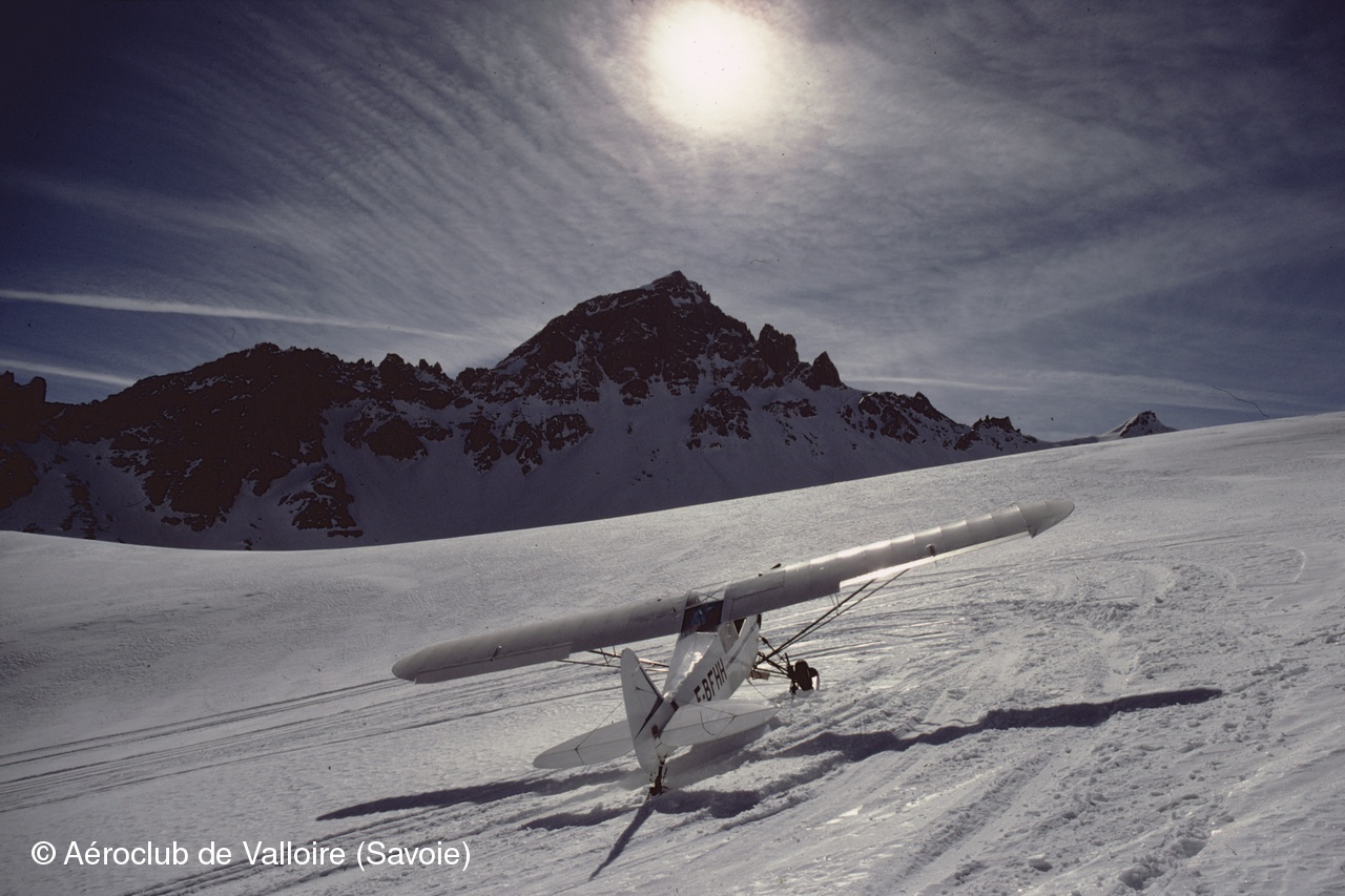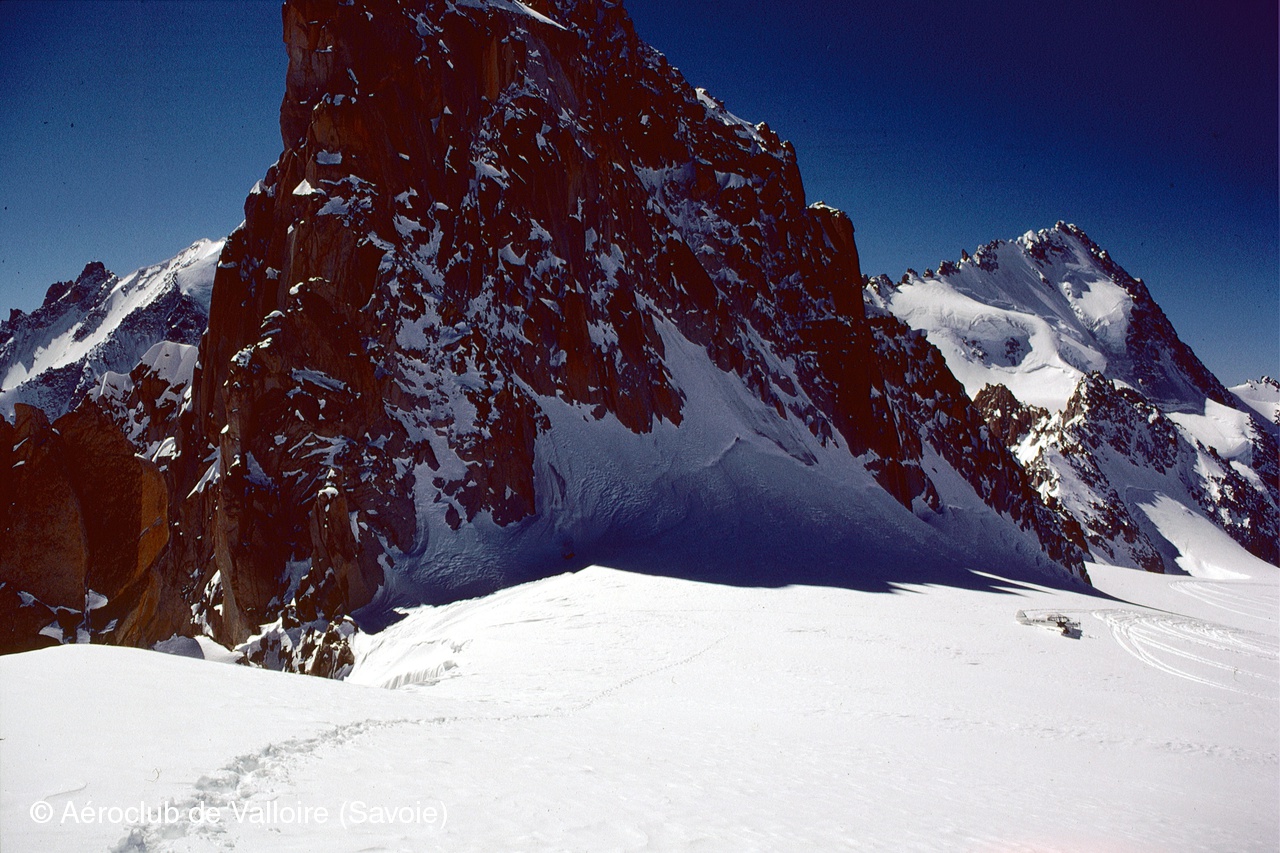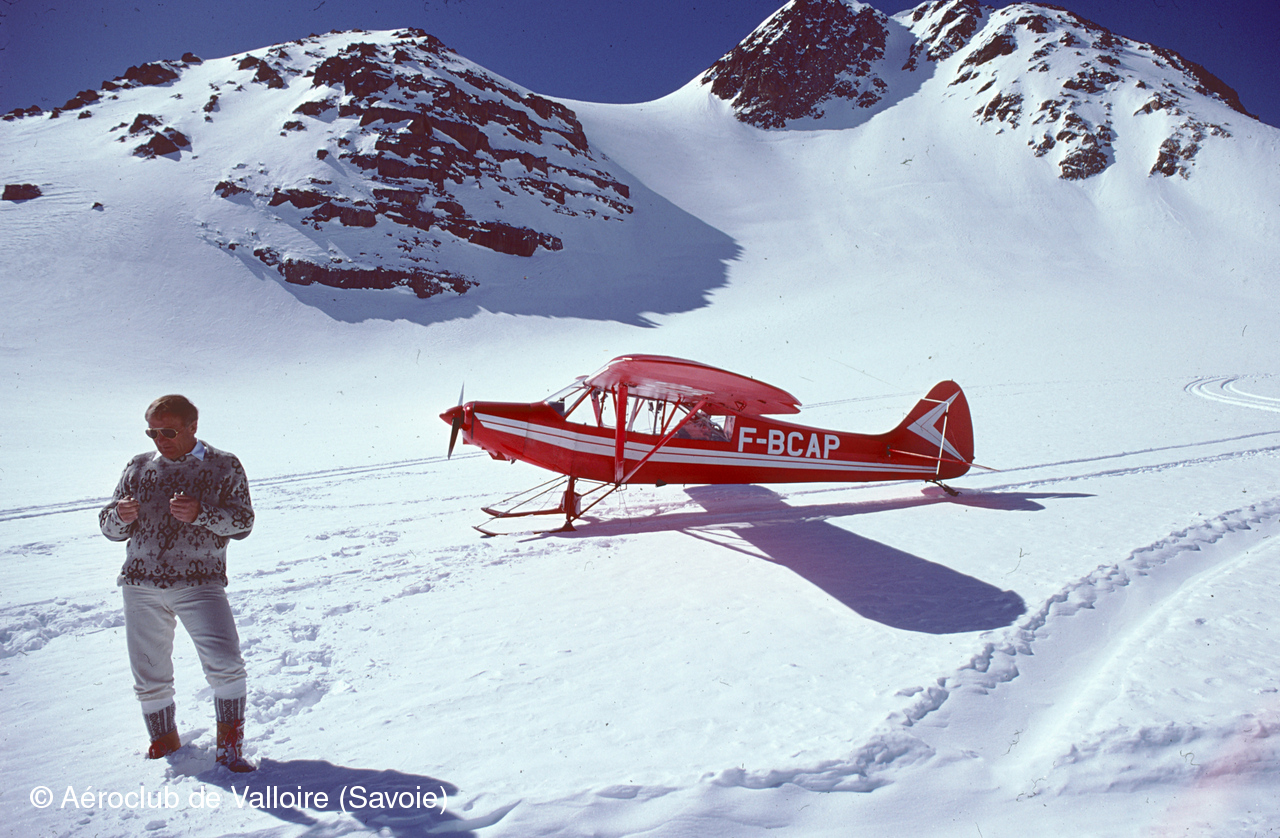 20AVR1985, glacier de l'Étendard, lieu-dit "la bosse à Collot", altitude 9600 ft : Nano Chappel, président de l'aéroclub de Méribel et moniteur vol montagne avion, photographié par son élève Jean-Pierre Contal.
